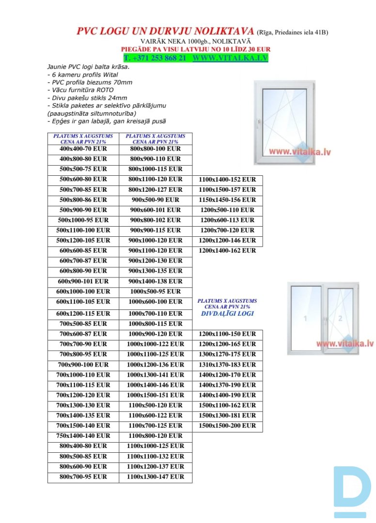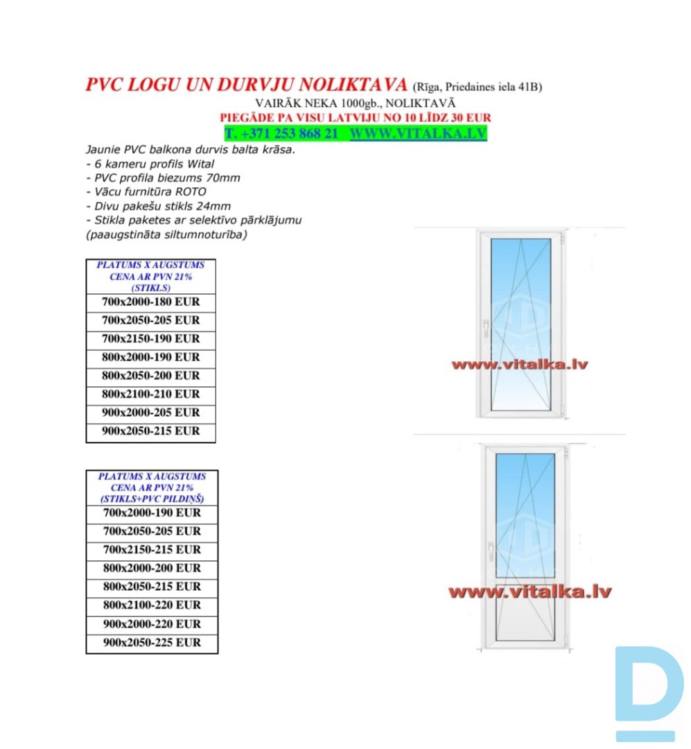 Jaunie Pvc logi un balkona durvis pieejami noliktavā Rīgā, Priedaines iela 41B. Visi noradīti izmēri piejami uzreiz. Piegāde pa visu Latviju, līdz jūsu durvīm no 10 līdz 30Eur. Zvaniet, arī ir What’s app. Jaunie PVC logi un balkona durvis balta krāsa. - 6 kameru profils Wital - PVC profila biezums 70mm - Vācu furnitūra ROTO - Pakešu stikls 24mm - Stikla paketes ar selektīvo pārklājumu (paaugstināta siltumnoturība) CENAS NORĀDĪTAS AR PVN 21% Cenas uz izmēri – uz foto. Noliktavas adrese: Rīga, Priedaines iela 41B, LV-1029 Darbā laiks: Darbā dienas no 8.00 līdz 18.00 Sestdien no 9.00 līdz 17.00 Svētdien BRĪVS T.253 868 21 (UZ ZVANIEM ATBILDAM BEZ BRĪVDIENAM) Zvaniet no 8:00 līdz 22:00. WWW.VITALKA.LV |